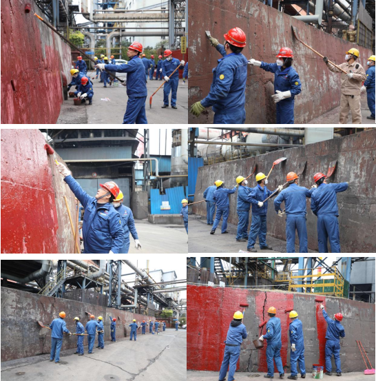 在现场,参与义务劳动的党员干部们分工协作,手持扫帚、铁锹、油漆滚筒刷等工具,有条不紊地对道路两侧围墙进行美化亮化,铲破旧墙皮、清扫墙面、油漆粉刷各司其职。经过一个多小时的美化,高炉一路两侧的围墙表面焕然一新。