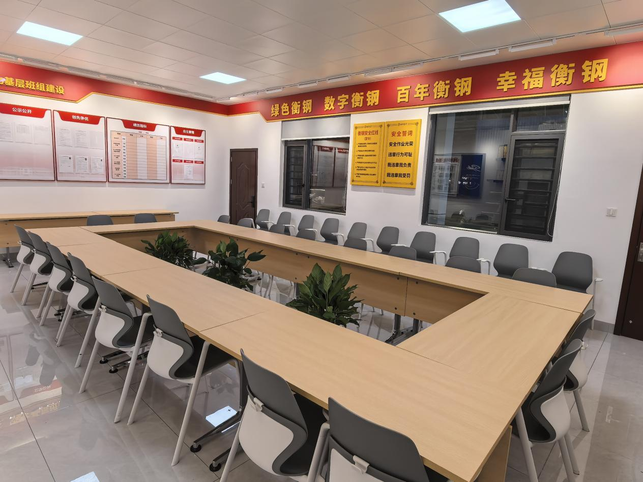 简约实用,从“有地方坐”到“坐得舒服”。“员工满意”是设计的核心,为了增强一线员工的体验感和舒适度,衡钢“货比三家”,精心选购了原木色与桃木色会议桌,灰白配色与黑灰配色的时尚座椅,确保桌椅不仅美观协调,更具备扎实耐用、耐脏易清理的特点,能满足不同需求。同时,为会议室量身定制了多功能资料柜和工具柜,妥善解决了学习资料、安全帽及各类工具的存放难题。