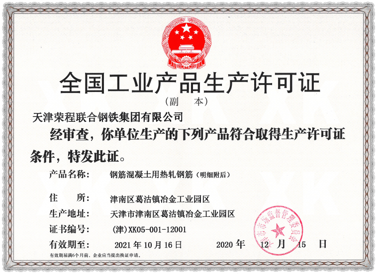 近日,荣程钢铁集团获得天津市津南区市场监督管理局颁发的钢筋混凝土用热轧钢筋生产许可证。这是2020年9月国家市场监管总局将建筑用钢筋等5类产品生产许可证审批权下放至省级市场监管部门后,天津市发出的首张建筑用钢筋生产许可证。