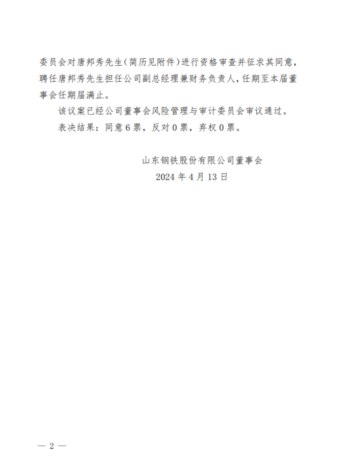 从《公告》中获悉,山东钢铁股份有限公司第七届董事会第三十六次会议以通讯表决方式审议通过了《关于聘任公司副总经理兼财务负责人的议案》一项议案,经公司总经理提名,董事会提名委员会对唐邦秀先生进行资格审查并征求其同意,聘任唐邦秀先生担任公司副总经理兼财务负责人,任期至本届董事会任期届满止。