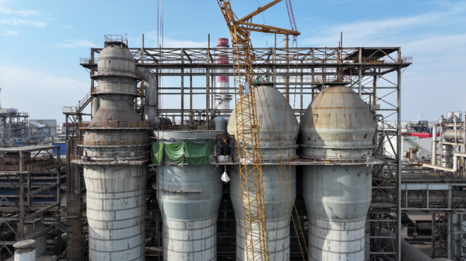 图为安钢4747m³高炉小拱顶热风炉切割炉壳改造为豫兴悬链线顶燃式热风炉,1#(右1)、2#(右2)热风炉改造完成已投产使用,3#(左1)热风炉正在施工阶段现场。