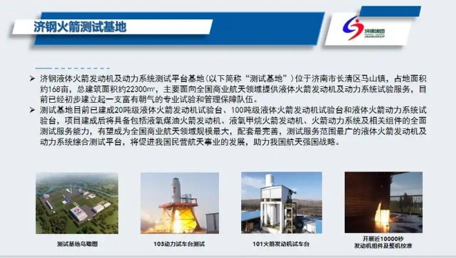 火箭动力测试板块中,济钢液体火箭发动机及动力系统测试平台基地占地面积168亩,已建成20吨级、100吨级发动机试验台及动力系统试验台,及相关配套设施,可全面提供液氧煤油、液氧甲烷发动机及动力系统全流程测试服务。