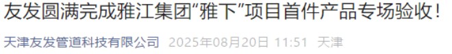 天津友发管道科技有限公司8月20日报道(点击链接查看全文:https://mp.weixin.qq.com/s/FIFRa8ygUa1P4rKrLPtVJg),近日,雅江集团“雅下”项目组领导一行先后莅临陕西友发钢管有限公司、天津友发管道科技有限公司,针对项目所需螺旋防腐保温钢管开展首件产品实地验收工作。经过系统验收,项目组最终出具结论:友发管道科技承制的“雅下”项目首件产品,关键指标全合格、质量文件全合规,首件验收通过。此次验收的圆满完成,标志“雅下”项目正式进入螺旋防腐保温钢管实质供货阶段。
