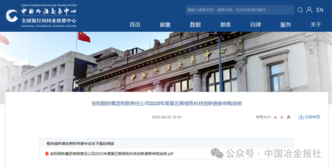 9月27日消息,安阳钢铁集团有限责任公司近日披露2025年度第五期绿色科技创新债券发行相关文件。