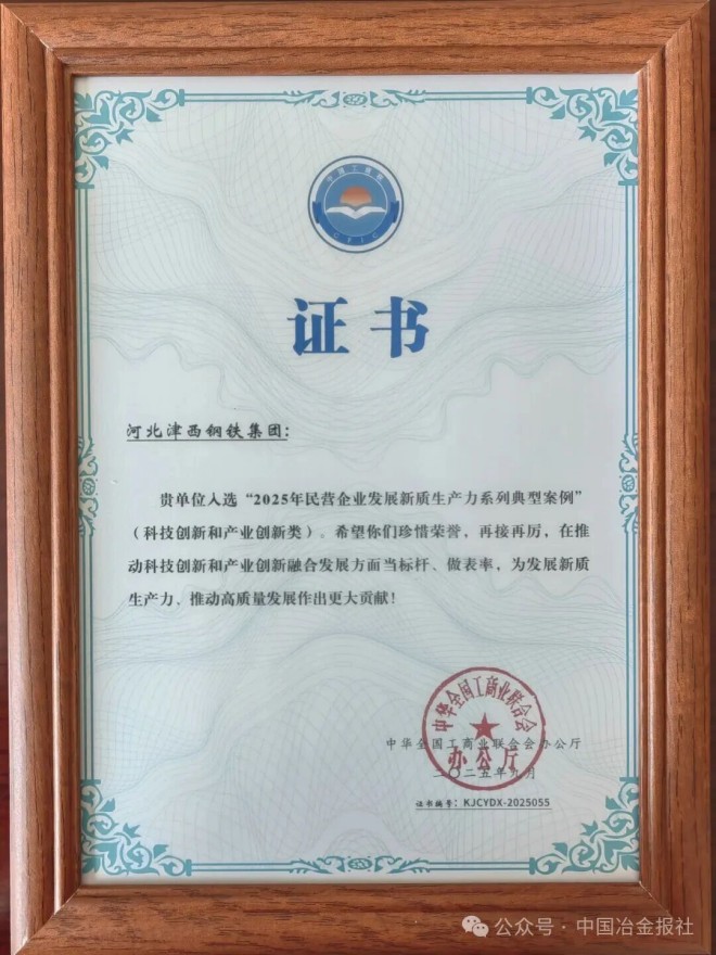 会上,津西集团《强链延链补链,产业创新赋能传统产业高质量发展》案例,入选全国工商联“2025年民营企业发展新质生产力系列典型案例”(科技创新和产业创新类),全国钢铁行业民营企业仅此一家入选。