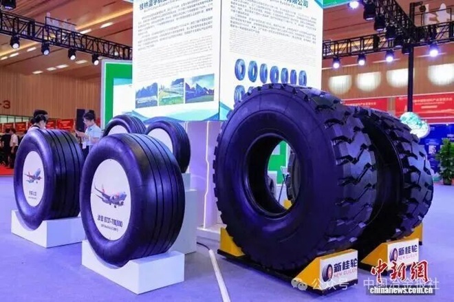 图为桂林蓝宇航空轮胎发展有限公司研制的飞机轮胎(左)。