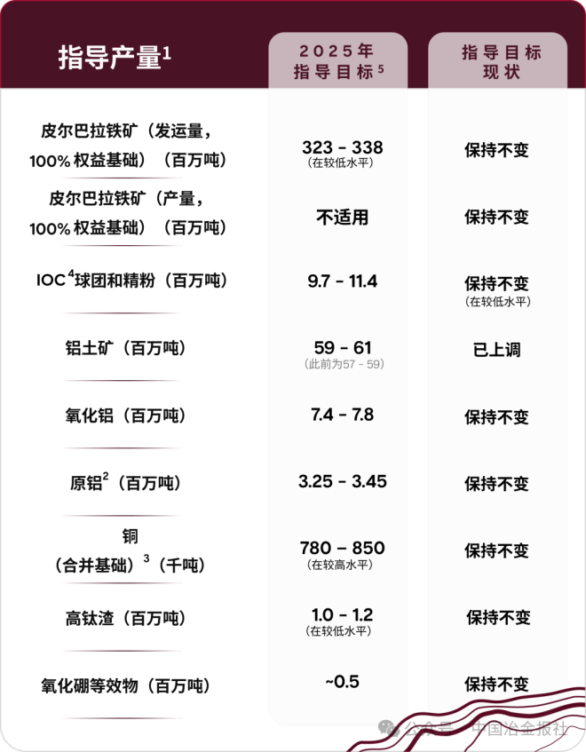 除铝土矿的2025年产量指导目标上调外,所有其他产品的产量指导目标保持不变。