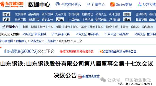 10月25日,山东钢铁发布了第八届董事会第十七次会议决议公告。