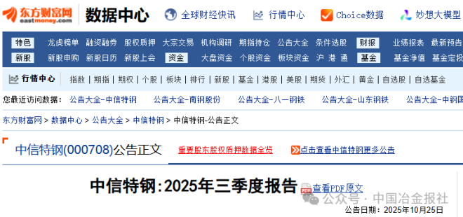 10月25日,中信特钢发布《2025年三季度报告》。