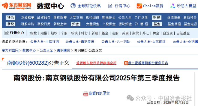 10月25日,南钢股份发布《南京钢铁股份有限公司2025年第三季度报告》。