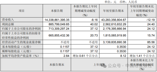《报告》数据显示,2025年1-9月,南京钢铁股份有限公司实现营业收入432.83亿元,同比下降12.19%;实现归属于上市公司股东的净利润21.76亿元,同比增长24.12%;加权平均净资产收益率8.12%,同比增加1.41个百分点。截至报告期末,公司总资产为701.28亿元,比上年度末增长1.48%;归属于上市公司股东的所有者权益269.62亿元,比上年度末增长3.59%。