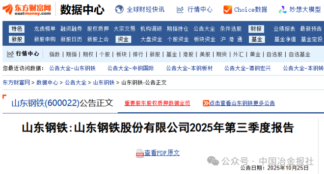 10月25日,山东钢铁发布《山东钢铁股份有限公司2025年第三季度报告》。