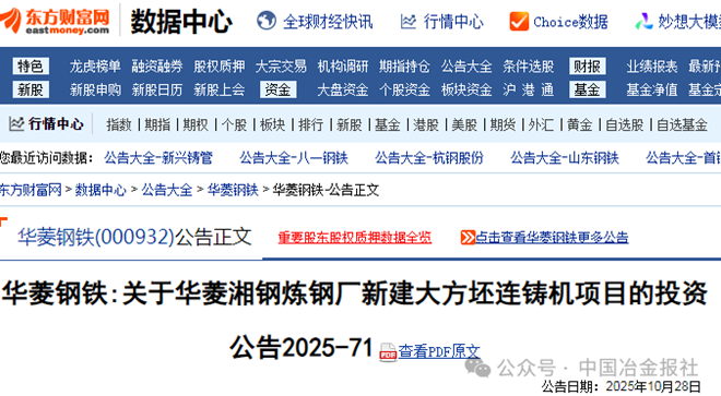 10月28日,华菱钢铁发布了关于华菱湘钢炼钢厂新建大方坯连铸机项目的投资公告。