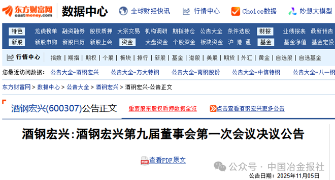 11月5日,酒钢宏兴发布《酒钢宏兴第九届董事会第一次会议决议公告》(以下简称《公告》)。