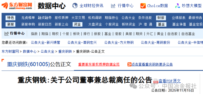 11月15日,重庆钢铁发布《关于公司董事兼总裁离任的公告》(以下简称《公告》)。