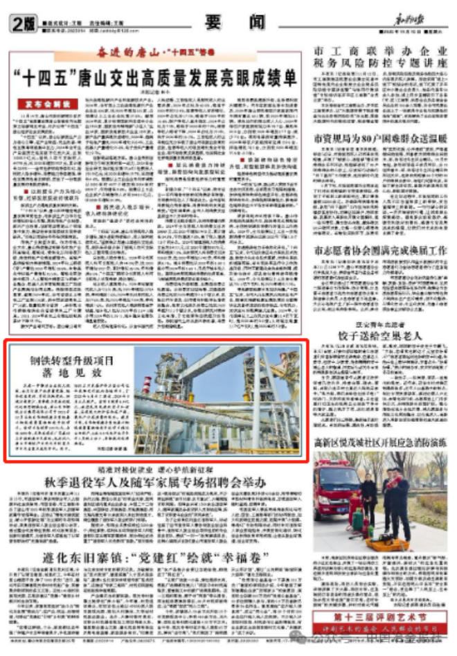 11月15日,唐山劳动日报发布《钢铁转型升级项目 落地见效》一文。