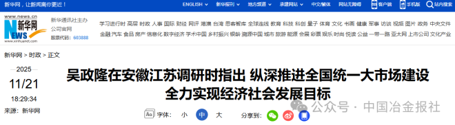 11月21日,新华网发布《吴政隆在安徽江苏调研时指出 纵深推进全国统一大市场建设 全力实现经济社会发展目标》一文。