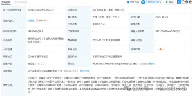 企查查消息,2025年11月21日,五矿世纪矿业(本溪)有限公司成立,法定代表人为刘增社,注册资本30亿元,由中国五矿集团旗下五矿矿业控股有限公司全资持股。该公司经营范围包含非煤矿山矿产资源开采、金属与非金属矿产资源地质勘探、矿产资源勘查等。
