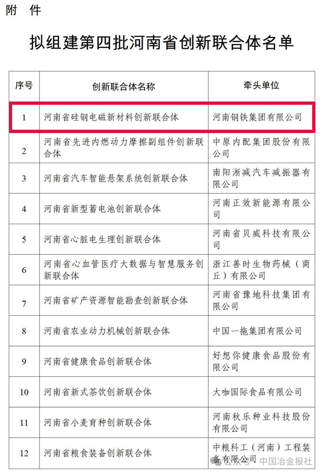 11月26日,河南省科学技术厅公示了拟组建第四批河南省创新联合体名单。名单显示,河南钢铁集团有限公司拟牵头组建河南省硅钢电磁新材料创新联合体。