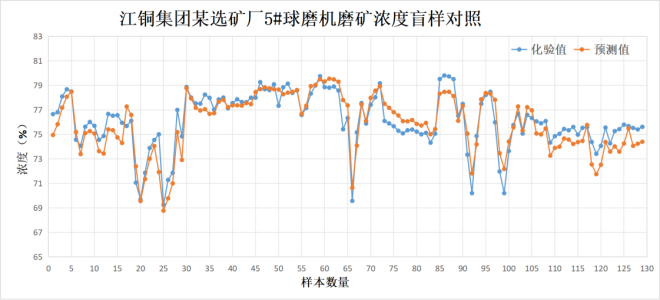 目前,产品已成功落地江铜集团某选矿厂、首钢集团某选矿厂等行业标杆企业。在江铜选矿厂的长期运行数据跟踪中,通过采集117组盲样进行误差分析显示:样本覆盖浓度范围的化验区间为69.25%~79.8%,预测区间为68.77%~79.54%,盲样总体标准偏差达1.51%,在线预测值与化验值相关性良好(R^2=0.83)。江铜集团某冶炼厂、晋南矿业某选矿厂等合作项目也在稳步推进,未来将为更多企业的磨矿工艺升级提供技术支撑。