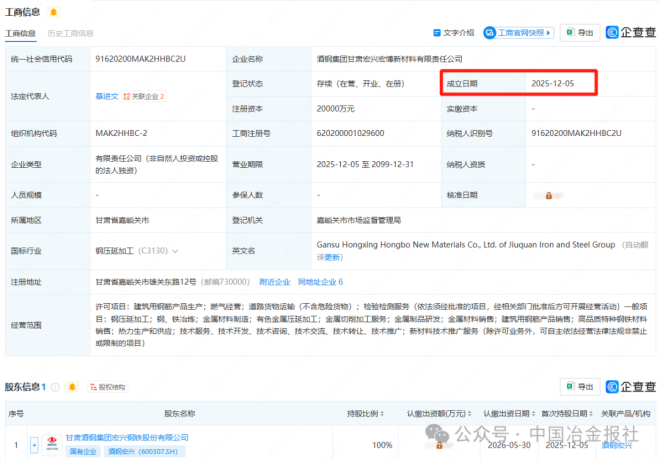 从企查查获悉,2025年12月5日,酒钢集团甘肃宏兴宏博新材料有限责任公司成立,法定代表人为慕进文,注册资本2亿元,经营范围包括建筑用钢筋产品生产、燃气经营、道路货物运输等。企查查股权穿透显示,该公司由酒泉钢铁(集团)有限责任公司旗下甘肃酒钢集团宏兴钢铁股份有限公司全资持股。