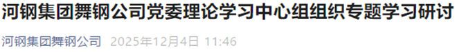 12月4日,河钢集团舞钢公司官微发布《河钢集团舞钢公司党委理论学习中心组组织专题学习研讨》一文。