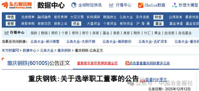 12月12日,重庆钢铁发布《关于选举职工董事的公告》(以下简称《公告》)。