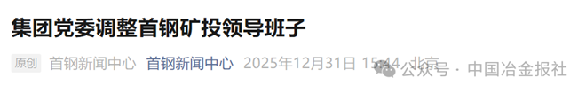 2025年12月31日,据首钢新闻中心公众号文章内容显示:首钢集团党委于2025年12月30日召开首钢矿投干部大会,宣布了领导人员职务调整的决定。