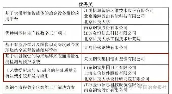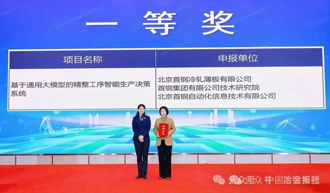 近日,由中国钢铁工业协会主办的“第五届智能制造创新大赛原材料(钢铁)行业赛道决赛”传来捷报:首钢冷轧、首钢技术研究院和首自信公司联合打造的《基于通用大模型的精整工序智能生产决策系统》项目,从25个入围决赛的优秀项目中脱颖而出,成功摘得一等奖桂冠。首钢京唐和首钢技术研究院《基于电磁感应加热的精轧温度智能控制系统》、首钢股份《钢铁企业智慧碳管理平台的创新与应用》2个项目获得三等奖。