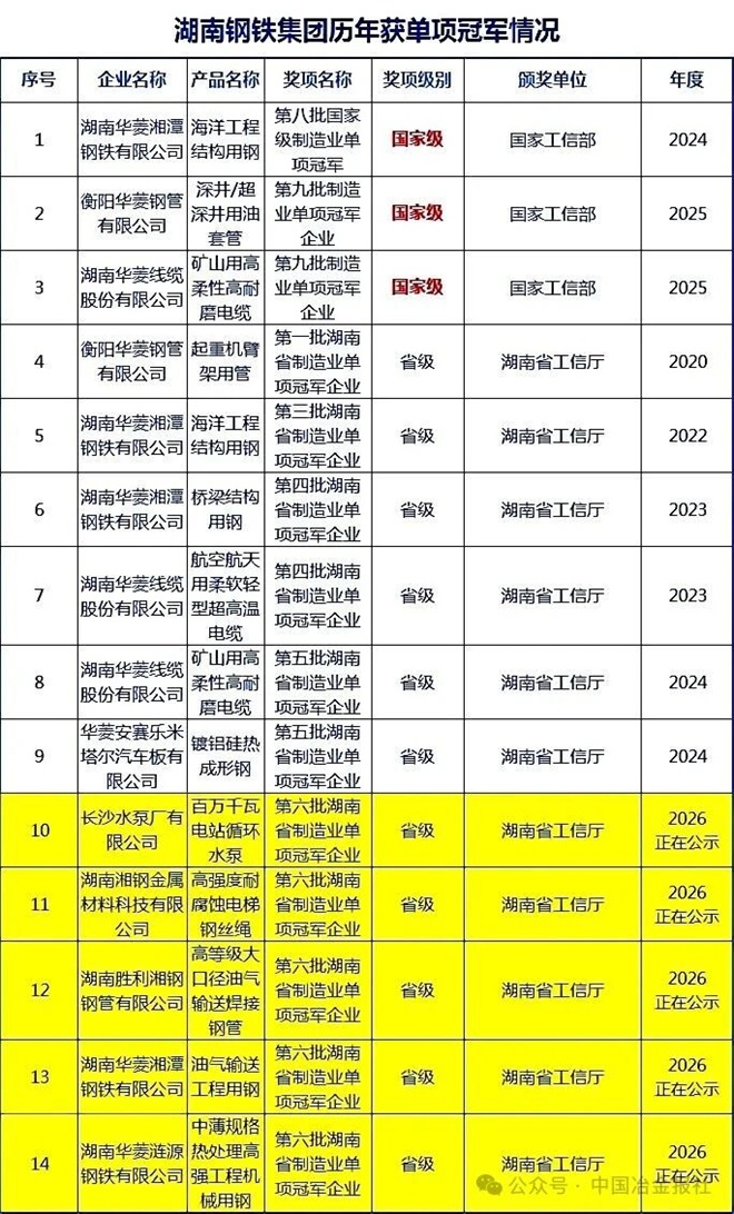 1月5日,湖南省工信厅发布的《关于第六批湖南省制造业单项冠军企业名单和复核通过第一批、第二批、第三批湖南省制造业单项冠军企业名单的公示》,湖南钢铁集团旗下湘钢、涟钢、长沙水泵厂、湘钢金属材料、胜利湘钢钢管等5家企业凭借细分领域的技术优势与市场领导力成功入选第六批省制造业单项冠军,湖南钢铁在高端制造领域的荣誉矩阵再添新绩。