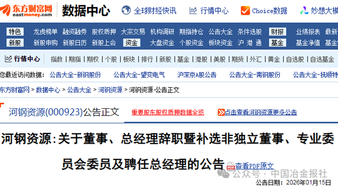 1月15日,河钢资源发布了关于董事、总经理辞职暨补选非独立董事、专业委员会委员及聘任总经理的公告(以下简称“公告”)。