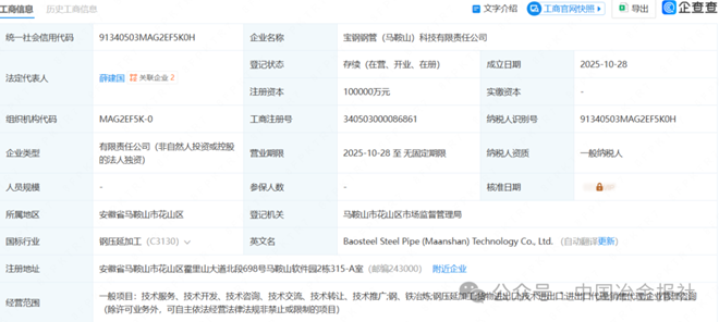 2025年10月28日,宝钢钢管(马鞍山)科技有限责任公司成立,法定代表人为薛建国,注册资本10亿人民币。经营范围包括钢、铁冶炼;钢压延加工;货物进出口等。该公司由宝钢管业科技有限公司全资持股,后者为宝钢股份全资子公司。