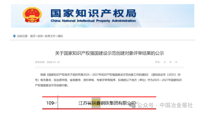 近日,国家知识产权局正式发布《2025—2027年国家知识产权强国建设示范创建对象评审结果的公示》,江苏省镔鑫钢铁集团有限公司(以下简称“镔钢集团”)凭借在知识产权领域的深厚积淀与卓越创新实力,成功入选“国家知识产权示范企业创建对象”名单。这一殊荣不仅是国家层面对公司知识产权创造、运用、保护、管理全链条工作的权威认可,更是公司践行创新驱动发展战略、赋能钢铁行业转型升级的重要里程碑。