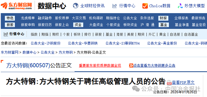 1月26日,方大特钢发布《方大特钢关于聘任高级管理人员的公告》(以下简称《公告》)。