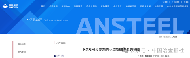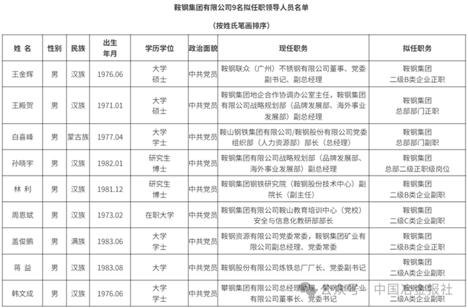 据鞍钢集团官网1月26日通告,经鞍钢集团有限公司党委研究决定,对9名拟任职领导人员面向全公司实施任前公示。具体如下——