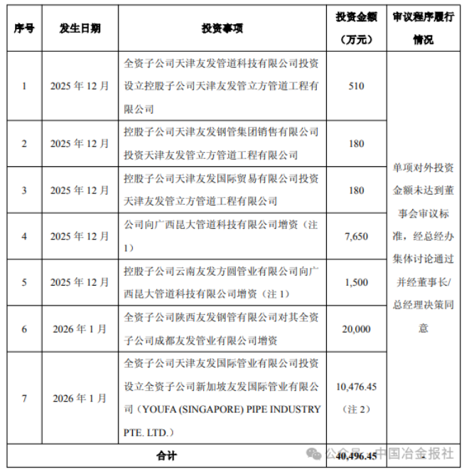 值得注意的是,本次投资是友发集团近期一系列战略布局的重要组成部分。公告披露,自2025年11月21日以来,公司及合并报表范围内的下属子公司累计对外投资金额(含本次但不含已履行董事会及/股东大会审议程序的对外投资)已达到公司最近一个会计年度经审计净资产的10%,但未超过公司最近一期经审计净资产的50%。除本次投资外的其他对外投资详细情况如下: