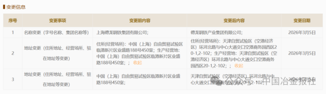 国家企业信用信息公示系统显示,2026年3月5日,原上海德龙钢铁集团有限公司已经完成名称变更、地址变更(住所地址、经营场所、驻在地址等变更)。