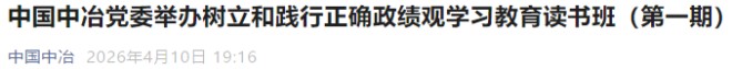 从中国中冶公众号获悉,4月10日,中国中冶党委举办树立和践行正确政绩观学习教育读书班(第一期),原原本本、逐字逐句学习《习近平关于树立和践行正确政绩观论述摘编》,认真学习习近平总书记关于制定实施“十五五”规划的重要论述和重要指示精神,以树立和践行正确政绩观推动“十五五”规划落地生根。中国中冶党委书记李仲泽主持读书班并作开班讲话;党委理论学习中心组成员出席并领学。