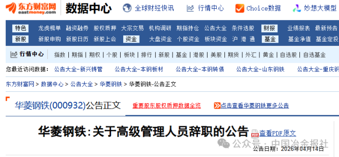 4月13日,华菱钢铁发布《关于高级管理人员辞职的公告》(以下简称《公告》)。