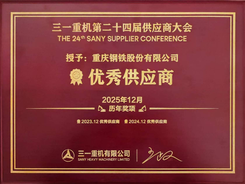 近日,三一重机年度供应商大会隆重召开,重庆钢铁凭借在资源保供、产品性能及质量管控方面的优异表现,再度荣膺“2025年度优秀供应商”称号。这份荣誉不仅是三一重机对重庆钢铁产品品质的肯定,更是双方深化战略合作、共筑产业链韧性的生动见证。