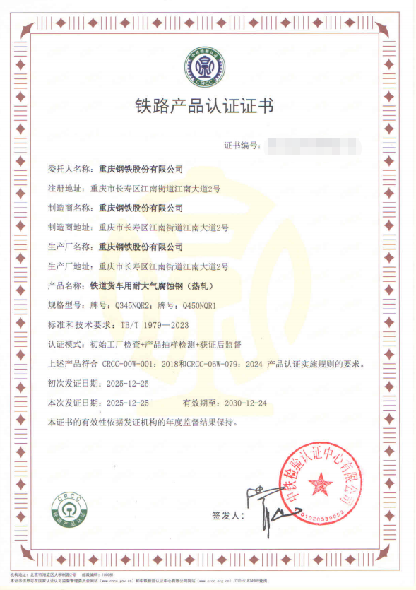 去年9月,CRCC专家组进驻开展现场评审,该公司各部门高效联动、精准响应,全面呈现的质量保证体系与规范化管理流程获专家组高度认可。与此同时,技术团队锚定产品标准,深耕成分设计与工艺革新,对八项关键性能指标开展多轮试验验证与参数优化,确保产品性能全面达标。10月,送检样品经CRCC检测全数合格,顺利通过实物质量审核。综合评审阶段,CRCC对重庆钢铁质量保证能力、标准化生产水平及产品质量稳定性给予充分肯定,正式颁发认证证书,成功跻身铁路货车用耐候钢板合格供应商梯队,为拓展高端特种钢材市场、开启铁路耐候钢领域新征程奠定关键基础。