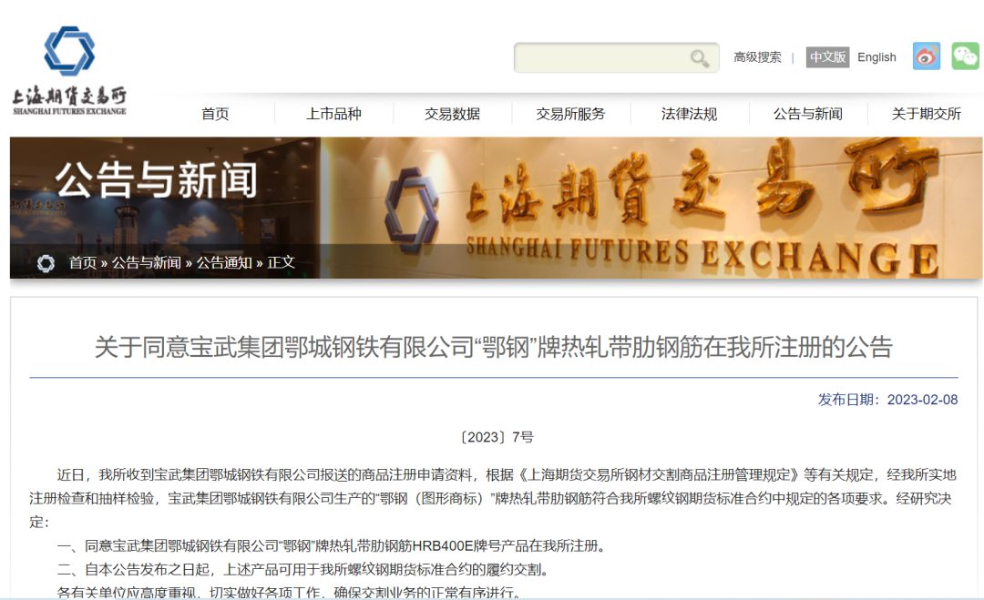 2月8日,上海期货交易所(以下简称上期所)发布公告,同意宝武集团鄂城钢铁有限公司“钢”热轧带肋钢筋注册上期所交割品牌。这是自2018年以后,时隔4年“钢”热轧带肋钢筋再次恢复成为上期所交割品牌。“钢”牌的成功注册,标志着公司螺纹钢产品进入高标准高质量行列,工艺技术、管理和服务体系能力均达到国内一流水平。