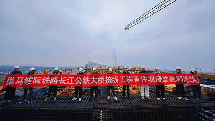 12月25日,中国十七冶承建的巢马城际铁路长江公铁大桥公路接线工程(和县侧)——主线桥首孔现浇箱梁顺利浇筑。
