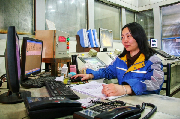 图为马钢长材事业部连铸分厂主控室女工徐维青通过MMI画面了解4#连铸机设备安全运行情况。