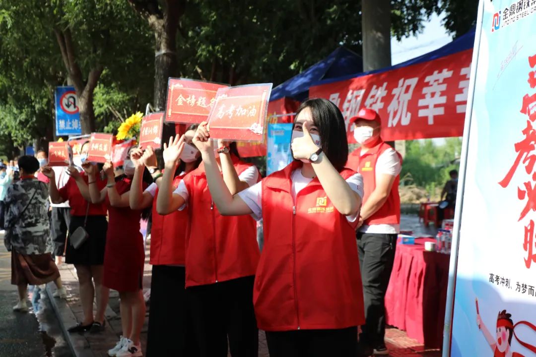 “红马甲”一早便到达考点,用心布置,在考点设置了爱心助考站,向考生提供免费的矿泉水、考试文具、口罩等爱心物资,以备考生不时之需,提前准备条幅“金鼎钢铁集团祝莘莘学子金榜题名”为考生及家长加油鼓气。