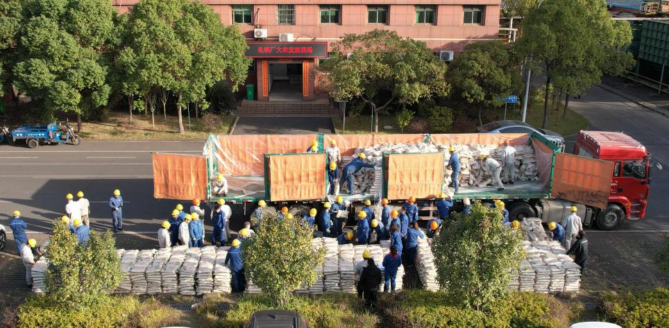 在大米发放现场,一派热闹景象,“共同奋斗创造美好生活”“大米发放现场”的横幅格外醒目,员工们分工协作,卸车、码放、分发有条不紊。大家或扛或搬,将蟹田大米稳稳运送到车上,喜悦与幸福在初冬的厂区里蔓延。