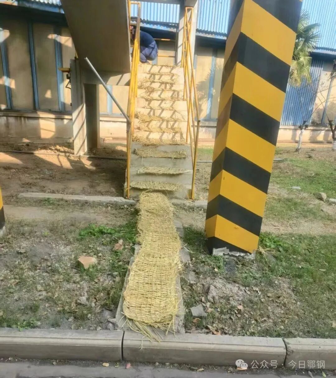 针对雨雪天气导致地面、楼梯、平台湿滑风险,在室外楼梯、走道、消防栓等区域铺设防滑草垫、稻草或采取防滑措施,并督促员工规范穿戴防滑鞋,避免“滑出来的事故”。(晏芳、袁国荣、黄亚群)