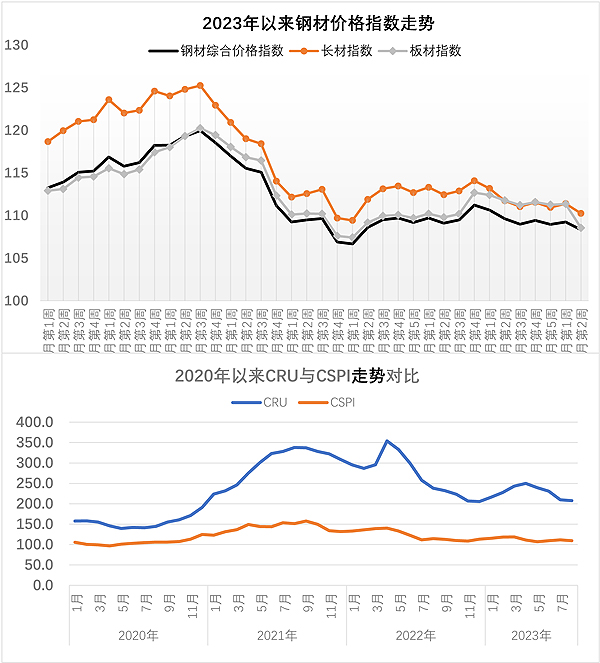 当周,中国钢材价格指数(CSPI)为108.83点,周环比下降0.41点,降幅为0.38%;比上月末下降0.14点,降幅为0.13%;比去年底下降4.42点,降幅为3.90%;同比下降3.83点,降幅为3.40%。其中,长材价格指数为110.25点,周环比下降0.34点,降幅为0.31%;比上月末下降1.30点,降幅为1.17%;同比下降7.90点,降幅为6.69%。板材价格指数为108.55点,周环比下降0.47点,降幅为0.43%;比上月末下降1.30点,降幅为1.17%;同比下降7.90点,降幅为6.69%。