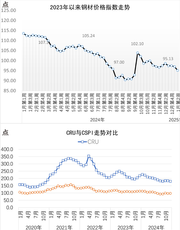 1月6日—10日当周,国内钢材价格指数大幅下降,长材价格指数、板材价格指数均有所下降。长材价格降幅大于板材价格降幅。
