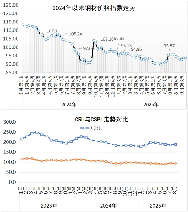 9月22日—26日,国内钢材价格指数环比略有下降。当周,中国钢材价格指数(CSPI)为93.63点,周环比下降0.06点,降幅为0.06%;比上月末下降0.39点,降幅为0.41%;比去年底下降3.84点,降幅为3.94%;同比上涨0.78点,涨幅为0.84%。其中,长材价格指数为94.16点,周环比上涨0.18点,涨幅为0.19%;比上月末下降0.97点,降幅为1.02%;比去年底下降6.06点,降幅为6.05%;同比下降3.61点,降幅为3.69%。板材价格指数为92.83点,周环比下降0.19点,降幅为0.20%;比上月末下降0.06点,降幅为0.06%;比去年底下降2.72点,降幅为2.85%;同比上涨3.48点,涨幅为3.89%。